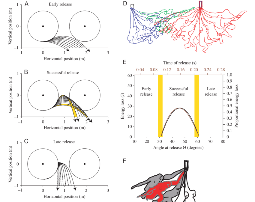 Because brachiation is a primary mode of transport for primates, they are extremely good at reducing energy losses during collisions. As mentioned before, in ricochetal brachiation, proper timing and release angle of the support arm is one of the most important factors. Too early of a release, and the primate undershoots the next hold and plummets to its death. Too late of a release, and the primate overshoots the smooth transition trajectory, requiring more energy dissipation and muscular effort to hold on and “reset” to the appropriate path into the swing phase. Although a slight overshoot is technically less efficient, it does create a safety margin, and some primates will even intentionally overshoot to prevent an early release. Release even later, though, and the primate doesn’t have enough horizontal velocity to carry it to the next hold, and it again plummets to its death. Poor monkey.